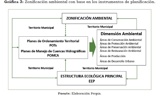 Las determinantes, seguidamente identificadas es la estructura que coadyuva a relacionar las distintas instancias administrativas para llevar la aplicabilidad de los distintos instrumentos de planificación entre ellos, el Plan Nacional de Desarrollo, Planes departamentales y municipales desde la aplicabilidad de la Ley 152 de 1994; además, el Plan de Ordenamiento Territorial del municipio Ley 388 de 1997 y Decreto 3600 de 2007; en términos ambientales y territoriales los Planes de Manejo Integral de Cuencas Hidrográficas respaldados por los Decretos 1729 de 2002 y 1640 de 2012 que complementan entre ellos, los procesos a seguir en los planteamientos de planificación y ordenamiento territorial las etapas metodológicas e identificación de instrumentos de armonización de políticas públicas que ayuden en cada uno de los espacios de las siete determinantes a la identificación de programas y proyectos comunes que fortalezcan las decisiones en conjunto con el fin de que las inversiones se realicen de una forma mucho más colectiva.