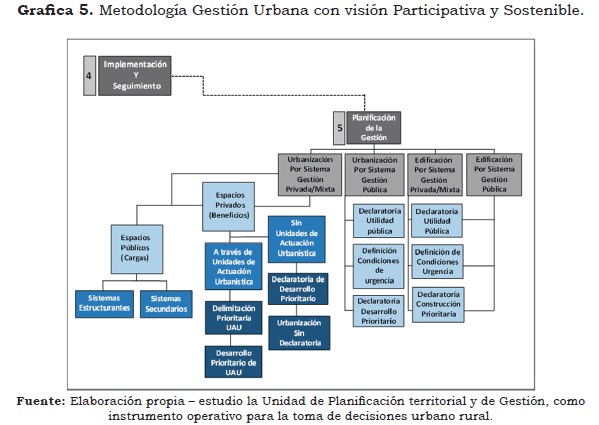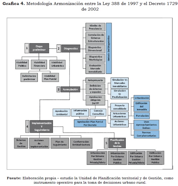 Para las características de la planificación de la gestión, se pueden identificar cuatro instrumentos el de urbanización por sistema de gestión Privada/Mixta; Urbanización por sistema de gestión pública; Edificación por sistema de gestión Privada/Mixta y Edificación por sistema de gestión pública. En lo referente de cargas urbanísticas determinadas como las obligaciones por las disposiciones normativas de los planes y sus reglamentos urbanísticos, a los propietarios de bienes inmuebles, reflejadas en la urbanización de terrenos y en las cesiones urbanísticas gratuitas a los municipios y distritos, para zonas verdes recreativas y equipamientos colectivos. (Ver gráfica Metodología Armonización entre la Ley 388 de 1997 y el Decreto 1729 de 2002; y Metodología Gestión Urbana con visión Participativa y Sostenible). Lo cual, se explicaría de forma sucinta en la etapa preliminar y síntesis del diagnóstico que retroalimenta de forma lineal la etapa de formulación e implementación del Plan de Ordenamiento en la etapa que se debe consolidad con la visión de la nueva generación en el reconocimiento de los instrumentos de planificación y de gestión vistos en los Pot's, Pd y Pomcas entre otros.
