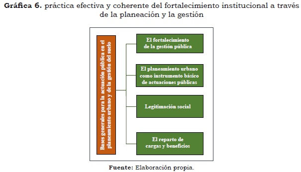 Finalmente, la construcción de la planificación regional ha requerido gran eficiencia institucional, teniendo en cuenta las ultimas promulgaciones de las políticas públicas, de las cuales depende su aplicabilidad y capacidad de gestión en sus diferentes niveles de prevalencia, desde lo nacional hasta lo municipal, de esta forma se genera un mejoramiento en la gestión y fortalecimiento institucional y su articulación hacia la sociedad que es el objetivo central hacia el mejorando de su calidad de vida. Las bases generales para la actuación pública en el planeamiento urbano y de la gestión del suelo, permite establecer un marco de referencia para enfrentar los principales desafíos del desarrollo urbano en interrelación con el área rural en el marco de la política y desarrollo de la globalización. La experiencia en el mejoramiento de la calidad de vida en La ciudad y el aumento de sus índices de productividad se ha fundamentado en lo general, en la puesta en marcha de la práctica efectiva y coherente del fortalecimiento institucional a través de la planeación y la gestión del suelo; implicando acciones en cuatro frentes: