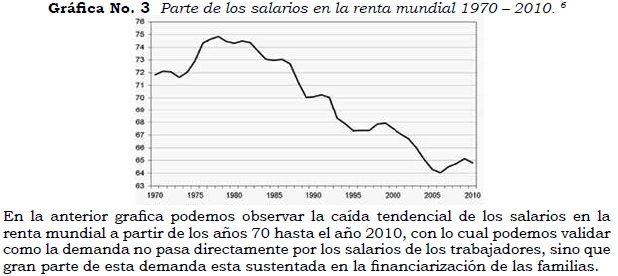 En la anterior grafica podemos observar la caída tendencial de los salarios en la renta mundial a partir de los años 70 hasta el año 2010, con lo cual podemos validar como la demanda no pasa directamente por los salarios de los trabajadores, sino que gran parte de esta demanda esta sustentada en la financiarización de las familias.