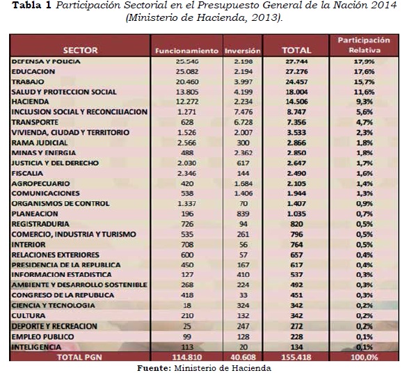 Ministerio de Hacienda. (1 de Diciembre de 2013). Presupuesto general de la Nación, Colombia 2014. Recuperado el 25 de Enero de 2014, de minhancienda.gov.co: http://www.minhacienda.gov.co/portal/page/portal/HomeMinhacienda/presupuestogeneraldelanacion/ProyectoPGN/2014/PRESUPUESTO%20 GRAL%202014.pdf. [ Links ]