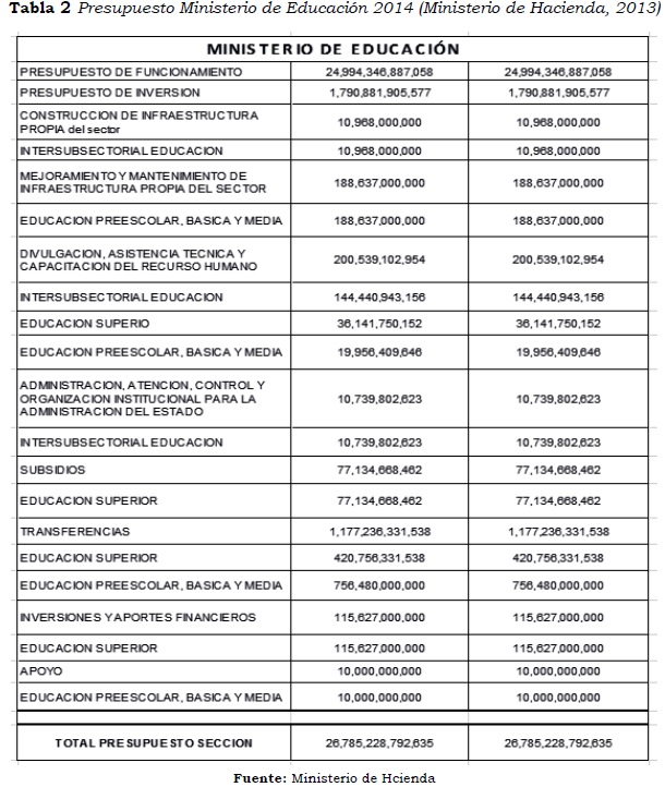 Desde el Ministerio de Educación el presupuesto para el año 2014 es tan solo de 536,383 millones de pesos lo cual no representa las necesidades que necesitan los centros de educación superior en Colombia lo que nos evidencia la práctica de desfinanciación y posterior imposición de mercantilización de los centros públicos como recomienda las instituciones financieras internacionales.