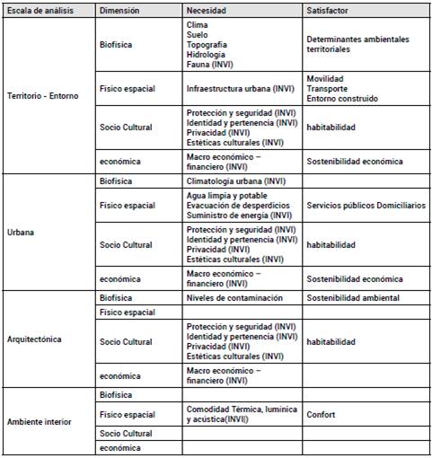 En la Tabla 2, se observa como las necesidades relacionadas con las dimensiones sociocultural y económica son variables intangibles y que no tienen una escala particular en la cual estén ubicadas y sean solucionadas.
