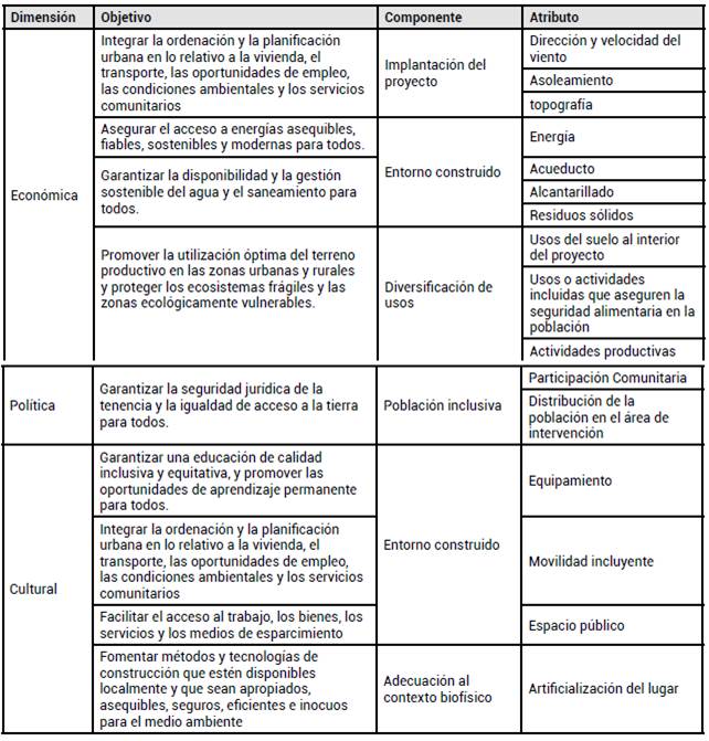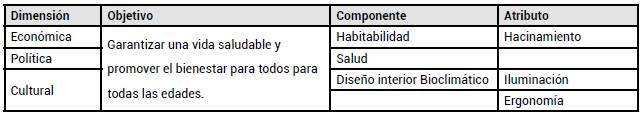 Tomando como punto de partida los objetivos planteados para el Sistema Habitacional propuesto en las diferentes escalas de análisis, se realiza uno de coherencia donde se presentan los objetivos del sistema y la manera como dicho objetivo o criterio se evalúa desde el sistema y a través de que componentes y atributos se logra.