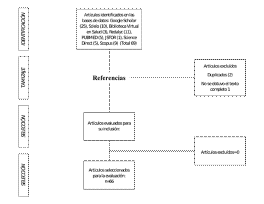 Para la selección inicial de los estudios se revisó el título, autores, medio y año de publicación, idioma, resumen y tipo de estudio; fueron excluidos tres y tras la lectura del documento en texto completo fueron seleccionados para el análisis un total de sesenta y seis documentos por cumplir con todos los criterios de inclusión (Ilustración 1).
