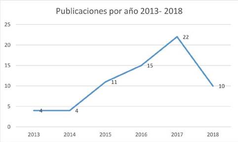 Con relación al idioma de publicación, 20 (30,3%) fueron en inglés, y según los años de publicación la distribución puede observarse en el gráfico No. 1. Nótese la tendencia al aumento en el número de publicaciones, y cabe resaltar que aún se encuentran en proceso muchas revistas de 2018. Este aumento podría ser explicado por el auge de los procesos de paz en América Latina.