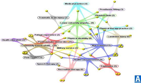 A partir de las palabras clave identificadas en el mapa cluster aduna de la figura 4, se evidenció que la rehabilitación de víctimas de MAP se relaciona a modo general con tres temáticas como: trauma de guerra “war trauma”, Reabilitación Basada en comunidad conocida por sus siglas en inglés CBR “Comunity Base Rehabilitation” y un tercer grupo “lower extremity amputation”. La palabra clave trauma de guerra se registró con la mayor coocurrencia (13), artículos que a su vez se vinculan con explosivos (2 artículos), amputación de miembros inferiores (1), pérdida de miembros superiores (2), miembro fantasma (1), servicio militar (3), estrés postraumático (1), terapias físicas (1), prácticas médicas (1) y cuidado personal de la salud (1). Asimismo, la segunda temática abordada es la RBC (10), relacionada con aspectos como: estrés postraumático (2), pérdida de extremidades inferiores (1), post conflicto (3), cuidados personales en salud (2) y educación en salud (2). En el tercer grupo amputación de miembro inferior es una palabra clave que se articula con los dos grupos trauma de guerra y RBC; a su vez este grupo relaciona palabras clave como: discapacidad física (8), práctica médica (4), experiencia del paciente (2), lesión por minas terrestres (1) ajuste en prótesis (1), miembro fantasma (1), lesión cerebral traumática (1).