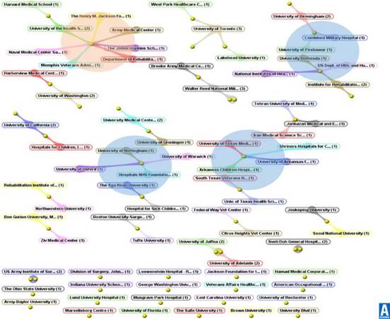 Respecto a la filiación institucional por país como se observa en la figura 3 a Estados Unidos como el país que posee el mayor número de instituciones con 46 (64%), que publican artículos referentes a la temática de estudio; seguido de Canadá con 7 (9.5%), Australia, Pakistán e Irán con 2 (8.1%) y Sri Lanka, Corea del Sur y Países Bajos con 1 (3.9%) del total. Las instituciones que establecen redes de trabajo con otras organizaciones cuentan con mayor producción de artículos: Walter Reed Army Medical Center con 3 artículos, University of Toronto con 3, University of the Health Sciences con 2, University of Birmingham con 2, University of California con 2. En contraste, se observó que las instituciones que no crean redes de trabajo con otras poseen un menor número de publicación de documentos.