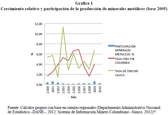 A pesar de que los últimos tres planes gubernamentales, aspiran a que Colombia sea una de las potencias latinoamericanas en minería para 2019 incentivando la producción hasta duplicar los niveles de extracción actual; hasta ahora el país no asume lugares de vanguardia. Peor aún, si descontáramos los escenarios de riesgo macroeconómico y el posicionamiento de la actividad nacional frente a la fijación de los precios en los mercados foráneos, que es de suyo preocupante; el horizonte de la composición, escala y redistribución del crecimiento de regiones como el Cauca, queda estrecho después de revisar los acontecimientos de la década. Mucho más, si de por medio hay historia y evidencia internacional alrededor de fenómenos como la "tragedia de los recursos naturales". De hecho, para el caso que nos ocupa, más allá de los impactos intraterritoriales en materia de inflaciones en zonas de explotación del departamento (enfermedad holandesa), vivimos una "tragedia de los recursos naturales" del tipo concentrado y localizado por casi la totalidad del periodo. Los efectos más graves se perciben en una actividad que, pese a los estímulos de los precios internacionales, sostuvo un comportamiento altamente volátil que a la postre no pudo mantener una participación sostenida dentro del producto interno regional; no obstante el relativo buen desempeño de los municipios de la Costa Pacífica. Igual suerte parece haber sufrido la redistribución, aunque los municipios del occidente, que contaron con un menor desempeño productivo, resultaron ligeramente mejor librados en materia de regalías.