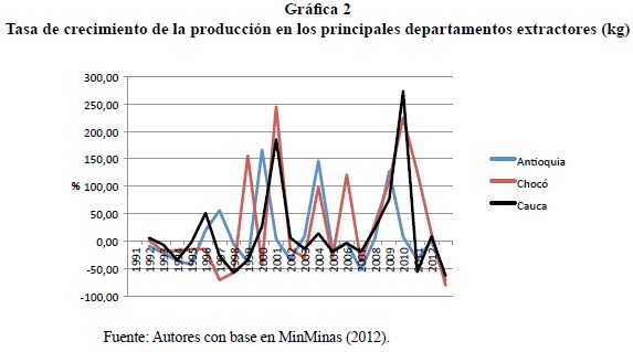 Como se puede apreciar en la gráfica 1, si bien el departamento creció por encima del promedio nacional, aprovechando los altos precios del café; la participación del oro en el PIB departamental, no superó el 1%. Tal cual, solo para 2001 y 2009, la tasa de participación sectorial rebasó el 0,6%, cosa que pone de manifiesto la forma en que al final de la década, el crecimiento de la producción sobrepasa a zonas de tradición minera como Antioquia y Chocó (véase gráfica 2), para luego encontrarse hacia 2012 con cifras de incremento porcentual negativas y cercanas a cero.