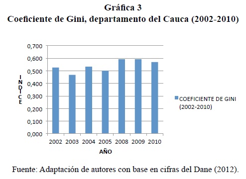 Sin embargo, la situación en materia de desigualdad y pobreza sigue casi inalterada. Con un coeficiente de Gini que bordea el 0,5 la concentración del ingreso, muestra que aproximadamente la mitad de la riqueza se queda en los grupos más pudientes del departamento (véase gráfica 3)11.
