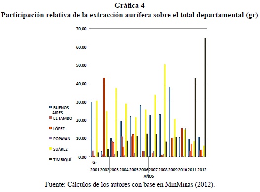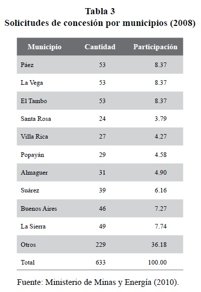 Nótese por ejemplo en la tabla 3, la inclusión de nuevos municipios de tradición no minera-aurífera como Páez, La Vega y Almaguer, junto a los tradicionales como Suárez, Buenos Aires y El Tambo.