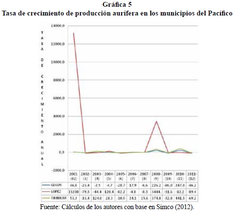 Más aún, si analizamos el crecimiento acumulado del periodo por zonas, se puede apreciar cómo después de toda esta especie de euforia por la extracción del metal; a la postre su producción fue relativamente pobre, en tanto que no pudo rebasar el 0,62% acumulado anual promedio. Si se observa la tabla 2, el gran peso del crecimiento durante el periodo -ceteris paribus las volatilidades intermedias- recayó sobre dos municipios de la Costa Pacífica, López de Micay y Timbiquí, cuyo rendimiento fue superior al 20%; no alcanzando a arrastrar la carga negativa de la producción de la zona occidental con Suárez a la cabeza (véase mapa 1).