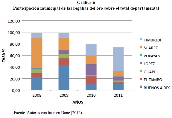 En materia de regalías, paradójicamente Suárez y Buenos Aires fueron los que tuvieron mayor apropiación de recursos (véase gráfica 6) hacia el final del periodo, con cifras que oscilaron entre el 30% y el 50% del total departamental, cosa que para El Tambo -en la misma zona- estuvo entre el 7% y el 14%.