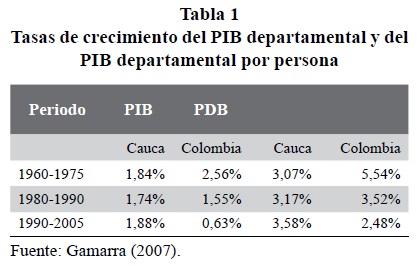A principios de la década del sesenta, el departamento del Cauca aportaba el 2% del Producto Bruto Nacional, mientras que en la década del setenta esa cifra descendió hasta llegar al 1,5% (véase tabla 1). En los años ochenta la situación permaneció igual, pero durante ese decenio, el aporte de la economía caucana al producto nacional fue en promedio de 1,72%. Dicha tendencia se mantuvo en los noventa y hacia el primer lustro del nuevo siglo. Según Gamarra (2007) "a partir de 1997 empieza un proceso de recuperación paulatina que se ha mantenido, sustentado en un mayor crecimiento del producto por persona y del total [...]" (p. 19).
