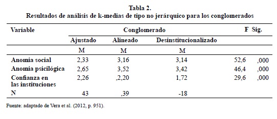 Jóvenes con descrédito institucional. Se constituye por aquellos jóvenes que tienen puntajes de 3,14 en anomia social, de 3,42 en anomia psicológica -que se consideran altos-y un puntaje bajo (1,72) en la confianza en las instituciones. Aun cuando este grupo presente menos puntajes de anomia que los alienados, tiene menos confianza en las instituciones, lo que es congruente con las distintas teorías de la anomia. Este grupo no confía en las instituciones, es decir, no da crédito y no legitima las acciones de estas, muestran un alto desajuste de las normas sociales, un desajuste de las reglas en el microambiente familiar y un nivel de hostilidad hacia las reglas sociales.