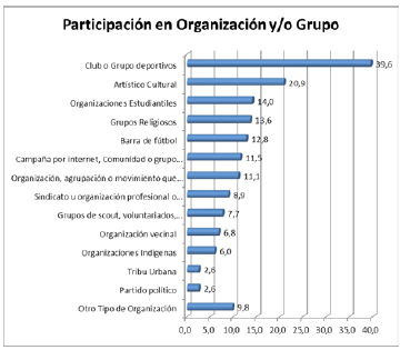 El concepto de participación no solo va ser variable en las dimensiones y formas aquí analizadas, sino que también va diferir las mismas en los mismos jóvenes sobre la visión y concepción que tienen de ella. Al preguntárseles sobre si participan en algún tipo de organización o grupo, solamente el 32,6% respondió afirmativamente. Sin embargo, al enumerarse los diferentes tipos de organización y grupos, el 61,4% refiere pertenecer, al menos, a uno. El 32,5% refiere estar en más de una organización. Es importante observar que casi el 60% de los consultados que refieren no participar, dicen que sí le gustaría.