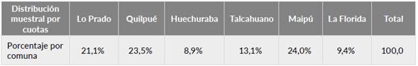 El método usado en este estudio es cuantitativo. Su objetivo fue levantar información base acerca de los jóvenes y la comunidad, por medio de encuestas, para analizar su participación. Se realizó una muestra aleatoria simple estratificada y por cuotas, correspondiente al porcentaje de población de cada comuna. Se asignaron cuotas iguales entre los sectores representativos comunitariamente dentro de ella; así como del porcentaje estimado del 20% de la población total, que es representativa acorde con datos censales y estadísticos a población entre 18 y 29 años. De la misma manera el tamaño de la muestra se calculó bajo un universo correspondiente a 29 250 personas; este es el aproximado de la población joven de las seis comunas estudiadas. A la misma se le aplicó un nivel de confianza del 95% para su muestra estadística, con una variabilidad del 50% y un margen de error del 5%. El total de la muestra fue de 380 personas, la Tabla 1 presenta los porcentajes de distribución muestral por comuna.