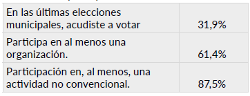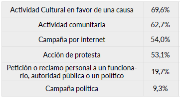 Así, desde esta mirada de la participación, vemos cómo en los jóvenes se dará una mayor participación social y comunitaria, principalmente desde ámbitos no convencionales. Tanto las prácticas convencionales como las no convencionales que los jóvenes opten en el espacio público no serían, entonces, formas excluyentes, ofreciendo más posibilidades de acción, más allá de las formas determinantes (y exclusivas) de acción. Desde este punto de vista podríamos encontrar individuos que llevaran a cabo actividades asociadas a ambas formas de participación (Ganuza y Francis, 2008).
