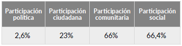 En cuanto a la participación social, el 66,4% refiere pertenecer, al menos, a una organización o grupo dentro de este ámbito (aquel en el que los jóvenes construyen desde sus propios intereses y necesidades, bien sea de manera convencional o no). El 87,5% de los jóvenes refiere participar, al menos, en alguna actividad formal o informal, algunas relacionadas con el ámbito político o ciudadano. La otra gran mayoría se adhiere al ámbito comunitario y social. La relación de porcentajes de participación reciente en los diferentes sectores se observa en la Tabla 4.