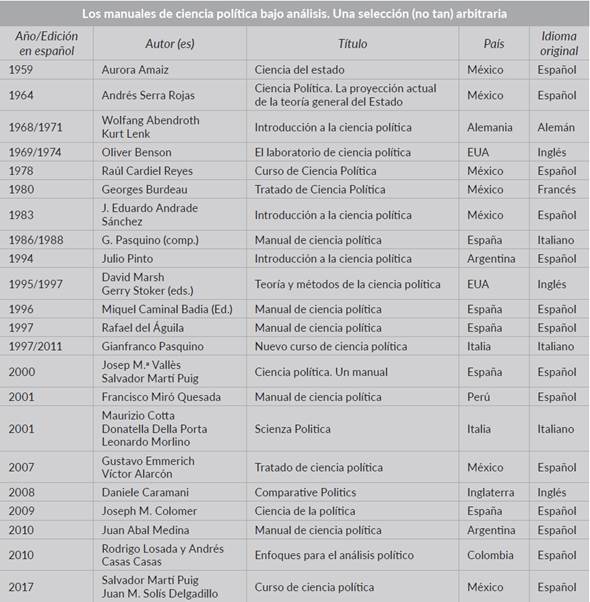¿Cómo podemos observar estas tensiones y los cambios que provocaron en la historia de la ciencia política en México y en América Latina? Los manuales son, en este sentido, útiles para observar la persistencia de paradigmas y los cambios dentro de una disciplina. No obstante, uno de los principales problemas es la selección de los manuales, pues existe una alta probabilidad de sesgo. Empero, es importante señalar que existen pocos manuales de ciencia política en comparación con los que hay y se producen en otras disciplinas, como aquellos introductorios a las ciencias sociales o a la sociología. Esta condición es también un indicador del desarrollo de la ciencia política: la poca existencia de manuales muestra que esta disciplina tardó en consolidarse como una ciencia singular.