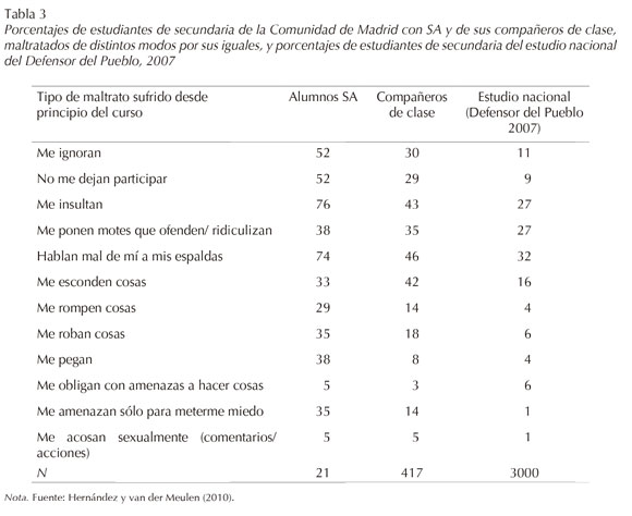 Van der Meulen y Hernández (2006) y Hernández y Van der Meulen (2010) llevaron a cabo un estudio para determinar la incidencia de maltrato en los 17 centros ordinarios de educación secundaria de la Comunidad de Madrid (España) en los que estaban escolarizados adolescentes con SA. Participaron 21 alumnos con SA (de ellos, 19 varones) y sus 417 compañeros. Se les aplicó un cuestionario basado en el utilizado en el estudio nacional del Defensor del Pueblo (2007), en el que se habían añadido preguntas sobre estrategias de afrontamiento y otras pidiendo los nombres de los compañeros a quienes otros compañeros trataban mal.