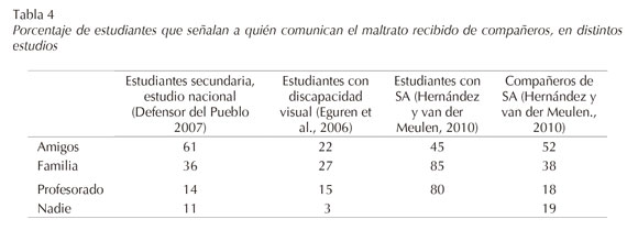 Las evidencias anecdóticas de que los estudiantes con SA sí suelen denunciar el maltrato se confirmaron en el estudio de Hernández y van der Meulen (2010), ya que se encontró que siempre lo contaban a alguien, fundamentalmente al profesorado y a la familia (80% y 85%, respectivamente). También estos alumnos, cuando observan que les ocurre a otros, reaccionan diciéndolo al profesor más que sus compañeros, pero intentan en mucha menor medida cortar directamente la situación. Estas reacciones resultan muy diferentes de lo que suelen hacer las víctimas de maltrato que no tienen una discapacidad, quienes buscan a sus iguales, especialmente a sus amigos (veáse la tabla 4). De esta manera proceden tanto los estudiantes victimizados que comparten aulas con los adolescentes SA estudiados, como los participantes en el estudio nacional (Defensor del Pueblo, 2007).