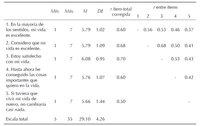 Por otra parte, se calculó la consistencia interna del instrumento a través del alfa de Cronbach, con lo que se obtuvo un valor adecuado (α = 0.81). El rango de la correlación ítem-total corregida estuvo entre 0.50 y 0.70. En la tabla 3 se presentan los estadísticos descriptivos de la SWLS tanto para la escala total como para cada uno de sus ítems. También se pueden observar las correlaciones entre los ítems.