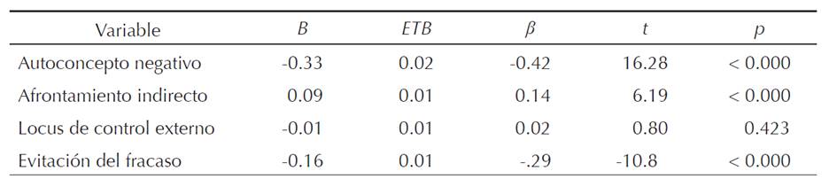 Los anteriores pasos para calcular un modelo de regresión con los aspectos positivos del ajuste psicosocial también se siguieron para los cuatro rasgos negativos (ver tabla 3). La introducción de las variables en el modelo se realizó en el siguiente orden: autoconcepto negativo (r = -0.53), evitación al fracaso (r = -0.48), locus de control externo (r = -0.23) y afrontamiento negativo (r = -0.19). Los resultados indicaron que el autoconcepto negativo y la evitación al fracaso fueron significativos, lo que explica el 33% de la varianza de la satisfacción con la vida.