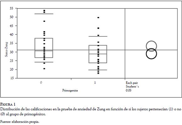 En la Figura 1 se presentan los resultados de los alumnos de Medicina que se identificaron como primogénitos (grupo=1) y que se autodescribieron con índices de ansiedad por debajo de los del resto de los participantes (grupo=0). Las diferencias entre ambos grupos fueron estadísticamente significativas (prueba t=2.05; p=0.04), siendo la media del grupo de primogénitos de 29.19 versus 33.48 para el grupo de los estudiantes con un orden de nacimiento diferente. En la parte derecha de la Figura la distancia entre los círculos representa el grado de diferencia estadísticamente significativa entre los grupos representados, de modo que a menor sobrelapamiento de los círculos, mayor diferencia entre ellos.