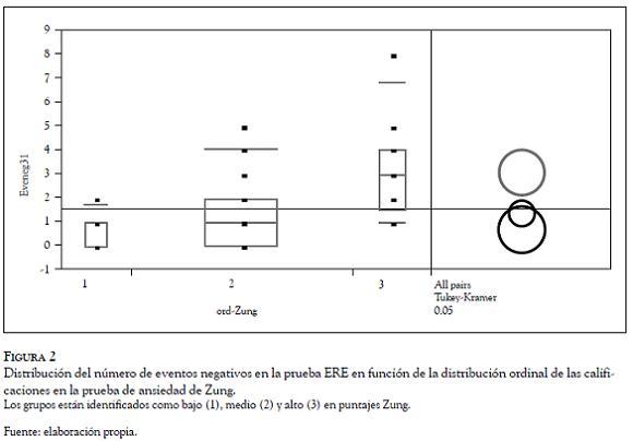 La misma tendencia se encontró al relacionar las calificaciones ordinales de la prueba Zung con los índices de impacto de los eventos negativos de la prueba ERE. El grupo con los niveles Zung de ansiedad más elevados (grupo 3), también reportó el mayor impacto por eventos negativos recientes, que lo hizo diferir del resto de los participantes (F = 11.33, p<0.0001), con valores medios de impacto de 1.58 para el grupo bajo en ansiedad Zung, 4.62 para el grupo medio y 12.92 para el grupo de ansiedad Zung alto.