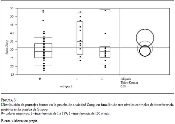 En la relación de los índices de ansiedad mediante la prueba Zung con la prueba conductual, se encontraron enlaces significativos solamente con los índices de interferencia positiva. Al organizarse dichos índices en tres grupos, índices con valores negativos (grupo=0), índices de interferencia entre 1 y 179 (grupo=1) e índices con valores superiores o iguales a 180 (grupo=3), se hallaron diferencias significativas en los puntajes brutos obtenidos en el autorreporte Zung, por parte del grupo medio (grupo 1) con respecto a los dos restantes; esto en el sentido de que el grupo con sesgo perceptual mayor a las palabras con carga positiva, fue el que se autodescribió como con niveles de ansiedad media en la prueba Zung (F=4.25, p=0.018). La Figura 3 muestra esta relación. Los valores de las medias para la prueba Zung fueron de 29.3, 37.2 y 30.9 para los tres grupos ordinales bajo, medio y alto organizados con base en los índices de interferencia positiva. En la Figura 3 se puede apreciar cómo el grupo 1 difiere significativamente del grupo 0 en cuanto a los puntajes del autorreporte y cómo esa diferencia es significativa vía la prueba Tukey-Kramer. Para esta medida el grupo 2, con el máximo nivel de interferencia positiva, no difirió significativamente del resto en cuanto al autorreporte de ansiedad Zung.