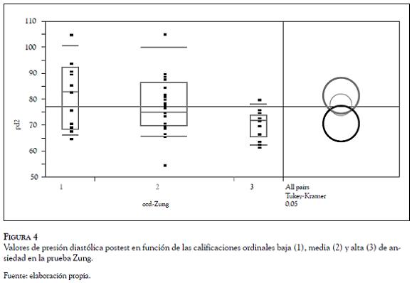 Al cruzarse los datos del reporte de ansiedad de Zung con las medidas de reactividad fisiológica, se encontraron relaciones significativas entre los valores absolutos de la presión diastólica postest con las calificaciones ordinales baja (1), media (2) y alta (3) de la prueba Zung.