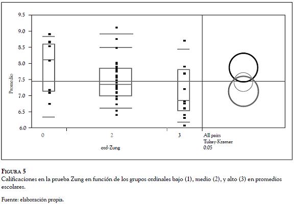 Con respecto a la relación de ansiedad verbal Zung con las calificaciones, no se encontró una tendencia distintiva hacia las calificaciones en la materia afín a las matemáticas, pero sí se encontró una relación con el promedio escolar acumulado, organizado en calificaciones ordinales baja, media y alta, a partir de las distribuciones cuartilares del grupo de participantes. En la Figura 5 se observa una relación lineal inversa entre los promedios escolares y el autorreporte de ansiedad Zung, difiriendo significativamente los grupos extremos bajo (1) y alto (3) con respecto a las calificaciones; el grupo con un nivel más elevado de ansiedad en la prueba Zung obtuvo los promedios más bajos. Las diferencias entre grupos fueron significativas entre los grupos con calificaciones extremas (F=4.21; p=0.019). Las medias de los puntajes Zung para los tres grupos ordinales organizados por sus promedios fueron de 33.5 para el grupo bajo (1); 32.9 para el grupo medio (2) y de 26.5 para el grupo alto (3).