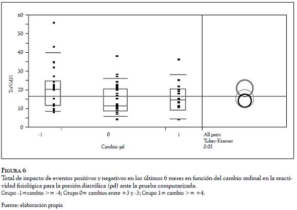 La Figura 6 muestra una diferencia significativa entre el grupo cuya presión diastólica descendió (grupo -1) con respecto al grupo sin cambio sustancial en ese indicador (grupo 0), siendo las personas que reportaron el mayor impacto emocional de eventos ocurridos en los últimos meses los que reaccionaron con mayor intensidad a la baja en su presión diastólica como resultado de la prueba computarizada. Las diferencias entre grupos fueron estadísticamente significativas (F=3.5; p=0.03), siendo las medias del impacto reportado de 17.7 para el grupo de cambio fisiológico descendente, de 10.5 para el grupo sin cambio y de 12 puntos para el grupo de cambio ascendente.