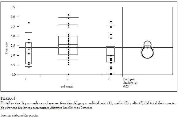 En cuanto a la relación entre los eventos recientes reportados y el desempeño escolar, no se encontraron relaciones significativas respecto a las calificaciones específicas en matemáticas, pero sí se registraron relaciones con respecto al promedio total, al agruparse a los participantes en función del total de impacto de eventos positivos y negativos reportados, que vendría a ser un indicador verbal de sensibilidad al estrés.