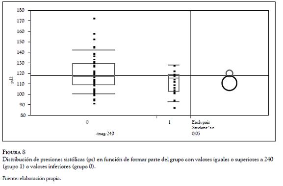 Las presiones sistólicas postest de las personas con índices de interferencia negativa iguales o superiores a 240 fueron significativamente diferentes a las de las personas con valores inferiores de ese indicador de la prueba de Stroop (t=2.14; p=0.03), como se puede apreciar en la Figura 8, siendo de 120 la media de presión sistólica postest para el grupo con valores de interferencia negativa inferiores a 240 (grupo 0) y de 110 para el grupo con valores iguales o superiores a 240 (grupo 1).