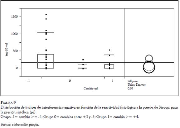 En la Figura 9 se presenta la distribución de índices de interferencia negativa de la prueba de Stroop en función de los tres grupos de reactividad sistólica; éstos grupos mostraron diferencias significativas (F = 4.8; p=0.01), siendo la media del índice de interferencia negativa de 282 para el grupo de cambio fisiológico a la baja (grupo -1), de 32 el valor para el grupo sin cambio (grupo 0) y de 79 para el grupo de cambio a la alta (grupo +1); de acuerdo a la prueba de Tukey Kramer, difirieron significativamente el grupo a la baja (-1) y el sin cambio (0).