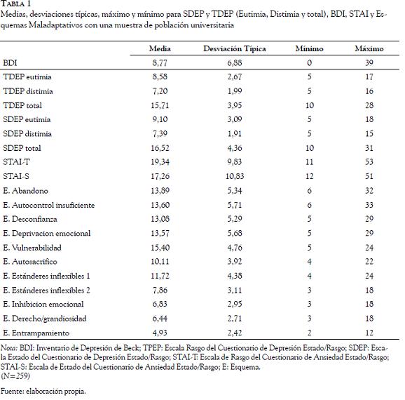 A partir de las medias de las puntuaciones del ST-DEP listadas en la Tabla 1, es de indicar que los estudiantes encuestados puntúan ligeramente más alto para estado que para rasgo de depresión con puntuaciones que oscilan entre 10 y 31 para estado y, 10 y 28 para rasgo; asimismo estas medias tienden a ser más altas que la media de las puntuaciones del BDI donde el rango de puntuación oscila entre 0 y 39. En cuanto a la media de las puntuaciones en ansiedad, la escala de rasgo muestra una media más alta que la escala de estado, siendo estas medias las más altas entre las puntuaciones de los instrumentos utilizados y con puntuaciones entre 11 y 53 para rasgo y, 12 y 51 para estado. En cuanto a los esquemas se resaltan las puntuaciones de