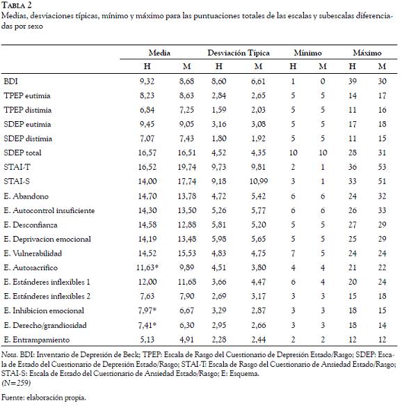 Al examinar la Tabla 2 sobre los resultados de la comparación de medias, sin que estas diferencias lleguen a ser estadísticamente significativas, se determina que los hombres tienden a puntuar más alto que las mujeres en el BDI, mientras que en las puntuaciones del ST/DEP y del STAI las mujeres tienden a puntuar más alto que los hombres. Sin embargo, en relación con los esquemas existen diferencias significativas a un nivel de p< 0.05 entre las medias, con una tendencia de mayor puntuación para los hombres en los siguientes esquemas: Autosacrificio (11,63), Inhibición Emocional (7,97) y Derecho/Grandiosidad (7,41)