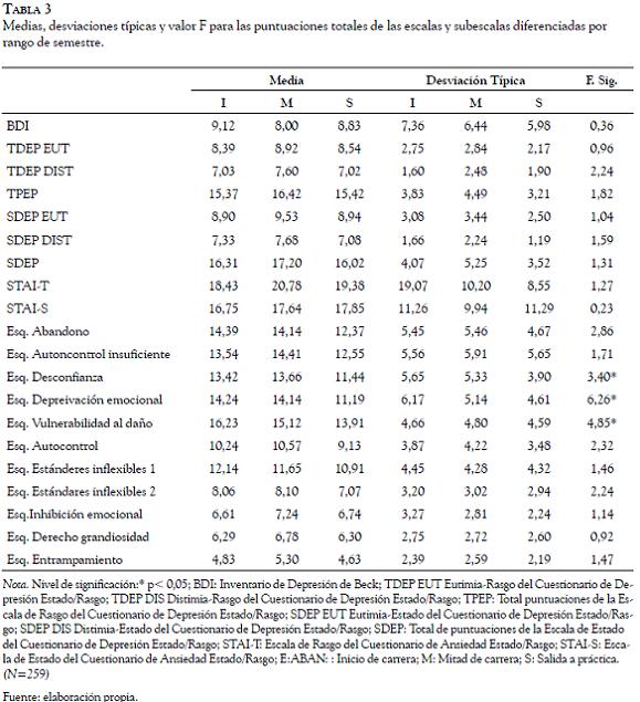 en la Tabla 3; según los cuales las únicas puntuaciones significativamente diferentes a un nivel de p<0,05 entre los semestres, se presentaron entre los esquemas de Desconfianza, Deprivación Emocional y Vulnerabilidad, tendiendo a presentar mayores puntuaciones los estudiantes que pertenecen al inicio de la carrera.