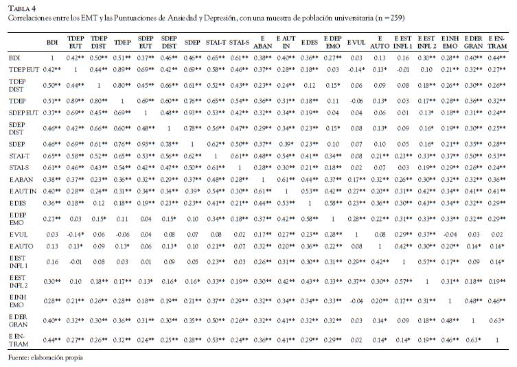 En lo referente al STAI, se indica que la escala de rasgo correlaciona significativa Tabla 4 amente (p<0,001) con el esquema de Autocontrol Insuficiente (0,54), Entrampamiento (0,53) Derecho/Grandiosidad (0,50) y Abandono (0,48).