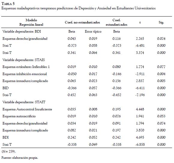 En cuanto se a la ansiedad, se indica que esquemas como los Estándares Inflexibles, la Inhibición Emocional y el Inmaduro/Complicado son los que mayor asociación muestran con la ansiedad estado. En este sentido, se puede entender cómo la tendencia a la competencia y a la perfección, de un lado, unida a la dificultad para expresar emociones y a la inmadurez emocional —evidenciada en la dificultad para diferenciarse afectivamente— características de muchos adolescentes, por otro lado, pueden ser predictores de respuestas de ansiedad ante los retos que supone la vida diaria; en el caso específico de la muestra, la ansiedad ante las situaciones típicamente presentes en los universitarios, donde se hacen notorias quejas relacionadas con la situación de evaluación, el rendimiento y el cumplimiento de metas académicas. Al mismo tiempo, llama la atención que también las puntuaciones en depresión se acercan como variables predictoras de la ansiedad lo cual muestra la posible continuidad entre ambos cuadros. Por su parte y siguiendo la línea de Ritterband y Spieleberger (1995), es de esperar que también la puntuación en ansiedad rasgo sea una variable predictora de la ansiedad estado, pues dentro de la concepción dimensional del trastorno la predisposición a responder de manera ansiógena aumenta la posibilidad de estados ansiosos en las personas.