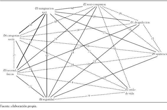 Para comprender mejor el sentido de estos temas, siguiendo la hipótesis teórica de la existencia de un sistema central de RS, realizamos un análisis categorial que nos permitiera ver la jerarquía (peso) entre estas categorías y otras que surgieron (véase Cuadro 2). Otro indicador utilizado para probar la hipótesis de centralidad en las cogniciones que hacen parte de la RS del HSC, fue el de la de similitud que nos permitía ver el tipo de relaciones establecidas entre las categorías. Recordemos que las RS se definen como un conjunto de elementos cognitivos que se relacionan entre sí; así que no solamente son los elementos de contenido y su jerarquía la que define el significado de la representación, sino también las relaciones y sus jerarquías. Para realizar este análisis, se calculó un índice de similitud sobre la base del criterio de coocurrencia; es decir, el número de veces en que las categorías fueron evocadas juntas. Con este índice de similitud calculado, es posible realizar un Graph de similitud que exprese gráficamente las relaciones establecidas por los elementos de contenido de la RS (véase Figura 3). Tres rangos han sido identificados, expresando diferentes niveles de importancia de las relaciones, representados gráficamente por el grosor de la línea. En este nuevo análisis, que incluye todas las palabras evocadas por el grupo, surgieron tres categorías nuevas que no están representadas en el prototipo y que hacen referencia a la percepción del vivir en la calle como un "estilo de vida", atribuyéndole aspectos incluso positivos, de carácter "romántico" (aventureros, libres, exploradores, etc.), una elección de vida o una forma de vida.