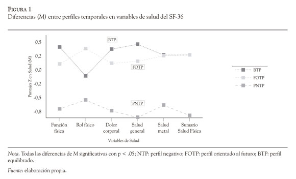 With a broad understanding of time perception, the dimensions positive past, negative past, fatalistic present, hedonistic present and future were grouped in profiles to assess relations with physical and mental health. Using a quasiexperimental design, 50 subjects matched for age and sex completed the Zimbardo Time Perspective Inventory and the SF-36, with 3 measures of time estimation. Pearson correlations and ANOVA showed significant relationships between dimensions, physical and mental health, and estimation. Three profiles were obtained, with the balanced one (BTP) having the best health indicators. These results support the idea that it is good to have a balanced profile that implies a positive attitude to the past, future orientation, and enjoying pleasant experiences. Also, health is influenced by time estimation.