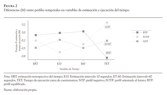 Agrupando cada dimensión del ZTPI según método percentil, y utilizando ANOVA aparecen diferencias significativas entre PN y ET10 F (2,47) = 3,35, p = 0.04, y por otra parte, la PF y ET60 F (2,47) = 8,99, p = 0.001. El análisis ANOVA no registra significación entre los perfiles y medidas ERT, ET10 y ET 60. No obstante, la prueba de Kruskal-Wallis observa diferencias significativas entre los perfiles y TET Χ2 (2, n = 46) = 8,66, p = 0.01. Si bien solo diferencias de perfiles en TET resultan significativas, en Figura 2 se muestra la tendencia de las medias donde BTP muestra sobrestimación y menor TET que otros perfiles.