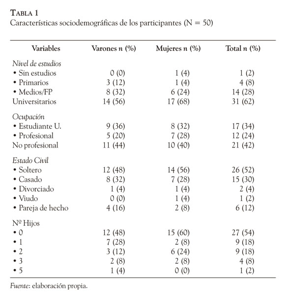 En el estudio participó un total de 50 personas, 25 hombres y 25 mujeres, de edades comprendidas entre los 20 y 70 años. La edad promedio de los hombres fue de 35.6 años (DT = 12.32; Rango: 23-68), y en las mujeres fue de 35.84 años (DT = 14.91; Rango: 20-70). Los participantes fueron reclutados de manera voluntaria, incidental, según diferentes contextos y edades predefinidas: estudiantes universitarios, jubilados, profesionales, labores de casa, empresarios y microempresarios, entre otros. De este modo, el contexto de evaluación fue heterogéneo. Se aseguró la confidencialidad de la información aportada.