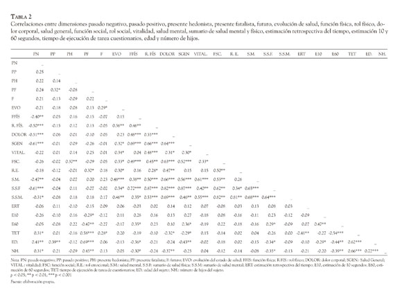 La matriz de correlaciones, en Tabla 2, nos muestra, respecto de la primera hipótesis planteada, en la cual se esperaba que las personas con una alta TP futura tuvieran una mejor CRVS, los resultados indican que la dimensión futuro presenta débiles correlaciones con las variables de salud, presentando una correlación positiva no muy potente con la evolución declarada de salud, r = -.29 (p < .05), lo que implica que a una mayor puntuación en F mejora la salud actual comparada con la de hace un año.