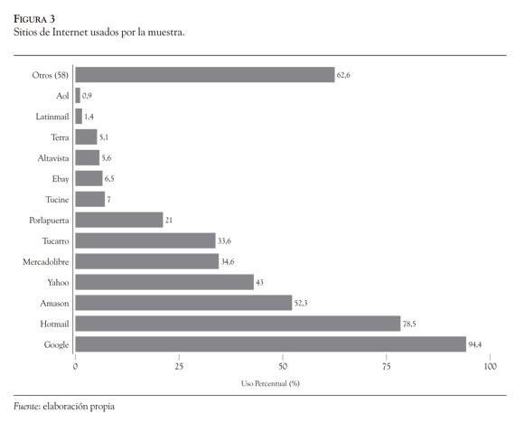 Al solicitar información sobre los sitios de Internet más usados N° 5 Apéndice, se pudieron clasificar dichos sitios, distinguiendo entre los que son visitados por el mayor número de informantes. Como se ilustra en la Figura 3, el 94,4 % de la muestra usa la página del motor de búsqueda Google, seguida por Hotmail; mientras que otros sitios preestablecidos como AOL (0,9 %) y Latinmail (1,4 %) son utilizados por menos del 2 % de la muestra.