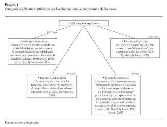 Debido a lo anterior, la presente investigación se desarrolla con el fin de trabajar las limitaciones encontradas en los anteriores estudios, por lo que se hace uso de categorías que parten del análisis de casos dentro de la perspectiva conductual, siguiendo el Método de Formulación de Caso de Codificación de Contenido (CFCCM, por sus siglas en ingles) desarrollado por Eells et al. (1998). Las categorías trabajadas por dichos autores son: la descripción del problema, los factores de predisposición, los factores desencadenantes y los mecanismos inferidos.